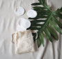 The reusable 8cm circles are made from 2 layers of super-soft bamboo fleece. They have a natural colour on both sides. The zero-waste pack is safe for you and the planet and contains 10 pads in a cotton laundry bag.