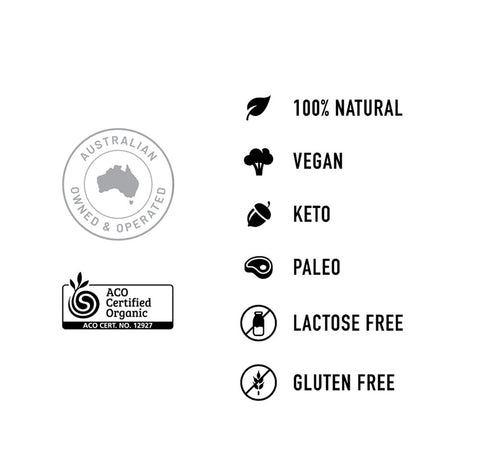 100% Natural, ACO Australian Organic Certified, GMO Free, Lactose Free, Gluten Free, Keto, Paleo, Vegan