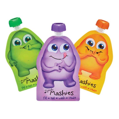 The Little Mashies Reusable Food Pouch is a high quality, reusable food pouch featuring cute Mashies Monsters that the kids will love.