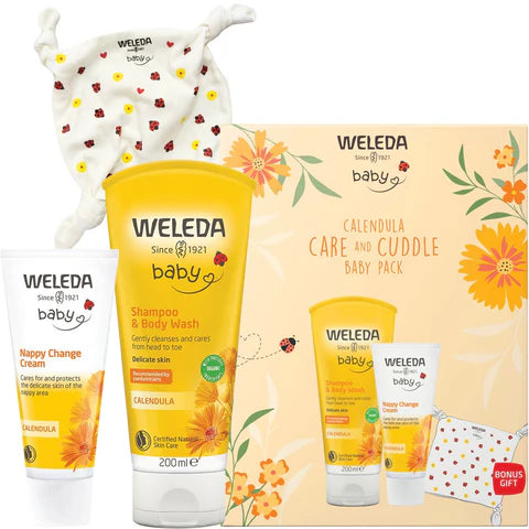 - Calendula Shampoo and Body Wash gently cleans baby hair and body. Weleda Nappy Change Cream soothes and protects the delicate nappy area. Includes a bonus soft and cuddly baby comforter, made from certified 100% organic cotton.